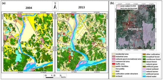 Examples of data used for damaged area detection in Sejong-si in South Korea. (a) Level 2 land cover in 2004 and 2013; (b) examples of areas subject to Environmental Impact Assessment (EIA) and land-use zoning areas (natural environment conservation areas) overlaid on Google Earth imagery.