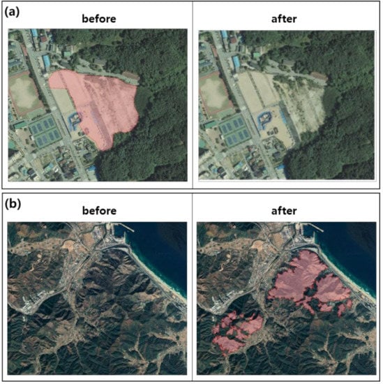 In this study, land-cover data from 2004 and 2013 were used, owing to the necessity of using the high-resolution land-cover map constructed for the entire country; at this time, the land-cover condition of the damaged area may differ from that of the present. To modify the differences due to time intervals, we used Google Earth data as the reference data. Google Earth is the most popular virtual globe software; it visualizes images as a global mosaic of the Earth using mid and high-resolution satellite and aerial imagery from multiple providers ranging from SPOT5 and Landsat up to aerial orthophotos []. The advantages of using Google Earth data are that they have a high resolution (65×65 cm), available for free, and describe the imagery date []. Google Earth’s high-resolution data have been used as reference data in many studies; previous research proved the horizontal and vertical precision of these images, and images from 2018 were selected for this study [,,].