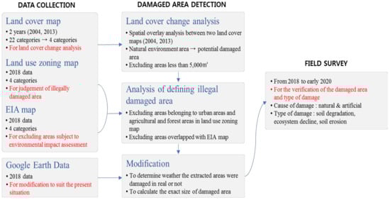 In this study, we aimed to introduce a two-step methodology to detect ecologically damaged areas and monitor them using both remote sensing and field surveys to build a damaged area database for legitimate restoration planning. We first used remote sensing data such as national standardized vector datasets and Google Earth data to analyze the illegally changed natural environment areas and then conducted field surveys to verify the derived results and determine the type of damage.