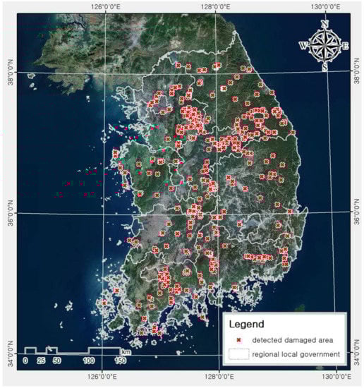 Distribution status of damaged areas in South Korea derived through remote sensing.