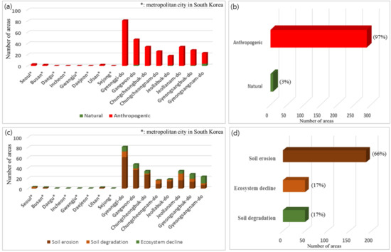 In the case of damage type, approximately 66% of damage was soil erosion. Soil erosion is a damage type that is a problem worldwide and is mainly caused by forestry and agriculture (Figure 7d). The intensity of soil erosion occurrence is worsening owing to increases in population and human activities []. Through field surveys, most damage in Korea was identified as soil erosion due to deforestation and development targeting forest areas. There were 50 cases of soil degradation and ecosystem decline, which are other types of damage. This was therefore a relatively less important type of damage than soil erosion. These two types of damage are also caused by deforestation, salinization, habitat loss, and fragmentation caused by urbanization and human activities and can also partially occur in areas where soil erosion has occurred [,].