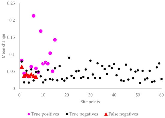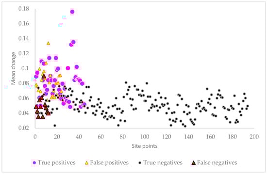 Eighty-two sites in the Jufra oases were analysed (Figure 16, Table 4). Our earlier research explored how many sites in Jufra had already been damaged over the course of the twentieth century [20]. At most sites, no change had occurred in the analysis period, and this was correctly identified by the change detection algorithm. A few sites where there had been changes were missed, but no false positives were detected (user’s accuracy of 100 %). The graph (Figure 17) shows the distribution of the mean pre-thresholded values for each buffer; some of the true positives are at the lower end because the ‘any non zero’ parameter allows even small instances of change represented by a single pixel to be picked up. The unaffected sites tend to have mean values below 0.1, and the false negatives were missed because their values were also low. A sample of sites was visited in the field by Lamin Abdulaati and the results checked.