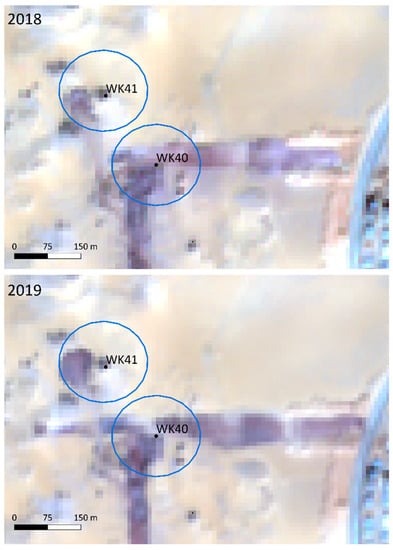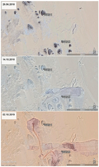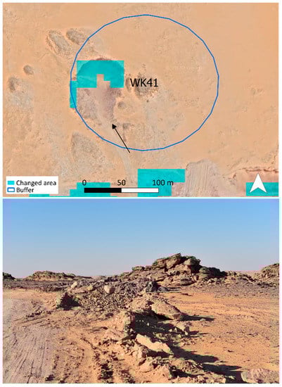 With a producer’s accuracy of 78%, changes/threats were correctly identified by the algorithm at 45 sites. These were confirmed by manual examination of the imagery and during field visits. In particular, the algorithm results highlight the rapid pace of development of ‘New Aswan’. Although the construction of the new settlement has been ongoing, since the start of the twenty-first century, the work continues to threaten the remaining archaeological sites in the area. Several sites were identified by the algorithm as undergoing changes caused by this big construction project. The script highlighted the sites of WK40 (scatter of lithic artefacts, now destroyed) and WK41 (rock art) where road construction, bulldozing, and dumping of spoil were taking place (see Figure 5, Figure 6, Figure 7 and Figure 8). The sequence of satellite images from Google Earth shows in higher resolution how WK40 was damaged by these changes in 2018, and that WK41 is at urgent risk (Figure 8), and therefore, must be a priority for protection efforts.
