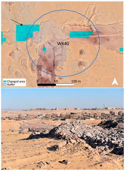 WK40.The blue region represents the detected changed area within the buffered zone. The direction of the photograph is arrowed. The photograph (January 2020) shows the track and piles of spoil at WK40. The construction of the track destroyed the site. ‘New Aswan’ is in the background. Google image 2020 imported as an xyz tile to QGIS.