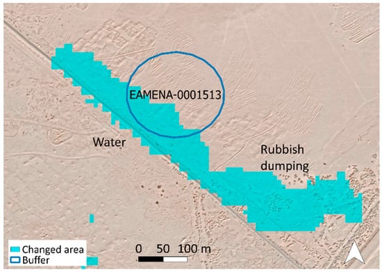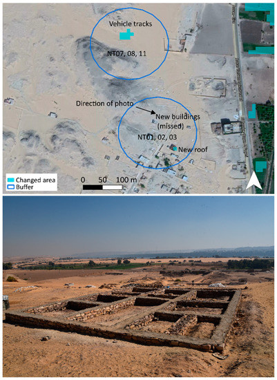 For most of the sites, no changes were detected within the buffered areas, and this could be confirmed by visual examination of imagery and through field visits to a sample of these sites in January 2020. While many of these sites consisted of features relatively far from current human activity, for example, prehistoric sites further up Wadi Kubbaniya, others were in the vicinity of locations where changes were detected. Therefore, monitoring should continue, with sites with recent changes prioritised for field validation in future seasons. The change detection workflow gives an early warning of human activities and natural processes.