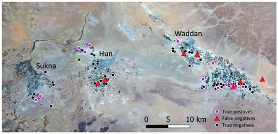 Sites analysed in the Jufra area. Sentinel-2 composite 2019–2020.