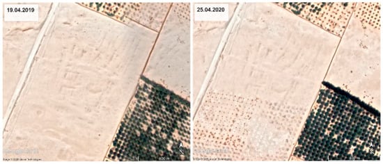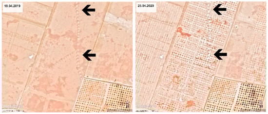 The producer’s accuracy (68%) shows that the algorithm failed to detect change at seven sites. The most significant changes which the algorithm missed were caused by the construction of new fields at a foggara (EAMENA-0001554) and at an area of walls/field systems which were probably contemporaneous with the nearby foggaras (EAMENA-0001553, see Figure 25). At both sites, the change consisted of rows of planting holes for trees which gave low values in the change layer (between 0.04–0.05). Lowering the threshold value would still not have detected this without greatly increasing the rate of false positives. The planting holes were not detectable in the Sentinel-2 imagery, but visible in the PlanetScope images. The available PlanetScope imagery of sufficient quality suggests that the planting holes at the field walls were dug at some time between 16–26 March 2020 (Figure 26).