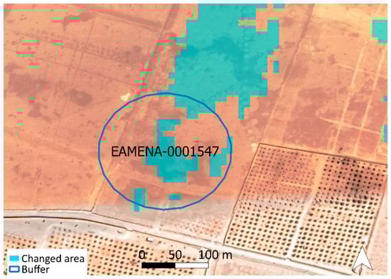 Some minor changes were too small to be identified by Sentinel-2 imagery, including single lines of vehicle tracks at EAMENA-0001494, a colour change on the surface sand at EAMENA-0001529, and a small extension to a building (c.6 × 6 m) at EAMENA-0001507, which was added in July 2019 and not identified by the algorithm. Part of a modern boundary wall at EAMENA-0001527 which was bulldozed during the analysis period was also missed. Discolouration, which may result from runoff, was missed at EAMENA-0001556.