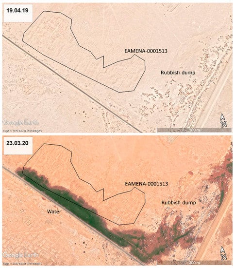 In the twenty-first century, commercial high-resolution imagery has allowed detailed recording (spatial resolution of 0.3–0.5), but it is very expensive. Some archaeological projects have used it for recording damage, whether by image interpretation [12] or automation [13]. Due to EU and US embargos, licenses for this kind of imagery often cannot be obtained for use in the Middle East and North Africa [14]. Given these political restrictions, as well as the high cost, it does not represent a good solution for widespread change detection. Due to these problems many archaeologists take advantage of the high-resolution imagery available in a limited form for free via Google Earth, Google imagery imported into QGIS etc.; however, this is provided stripped of its original radiometric information. Google Earth has been used extensively by EAMENA, AKAP and Trans-SAHARA for image interpretation [2,15] as well by as other projects working in the region [16].
