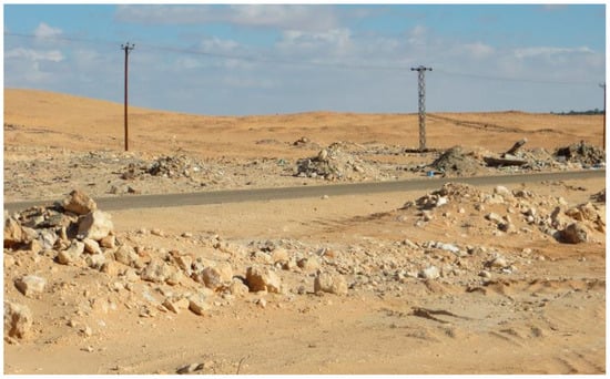 Rubbish dumping affects several sites in Jufra, with a range of undesirable effects: Rubbish dumps are frequently the site of fires and are often bulldozed, are subject to pollution and the impact of multiple vehicle tracks. Although outside the buffered area of the site, an extensive dump was detected close to the medieval town of EAMENA-0001513. A change in the colour of an existing road which truncates an area of cairns (EAMENA-0095144) may also be due to dumping/burning of rubbish.