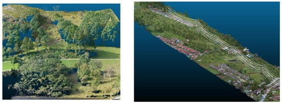 A visualization of the goal of the research, i.e., the results of the 3D reconstruction of power lines (source: FlyTech unmanned aerial vehicle (UAV) test flights)—power line over the UAV-derived point cloud representation of the digital surface model (DSM).