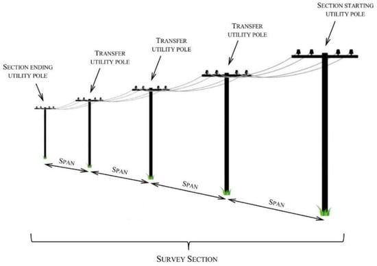 For the seamless operation of the algorithm, a power line fragment targeted in a UAV flight survey mission was divided into survey sections that were subjected to further processing. The section was defined by a starting utility pole, transfer utility poles, and an ending utility pole. One survey section might have consisted of several power line spans (Figure 5). The order of the poles in the survey section determined the direction of subsequent image processing, and thus had a crucial effect on the entire process of power line detection.