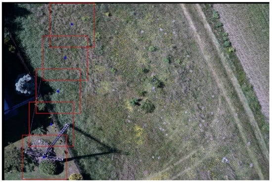 Separately, for each wire in the image, the process of detection was conducted over small image segments. The position and order of the segments were calculated according to the approximated position and direction of the wire, and they were evenly spaced, with at least a 10% overlap, along the line between the captured utility pole (if present) and the boundary of the image (Figure 10). The order of the segments was set along the direction of the power line.