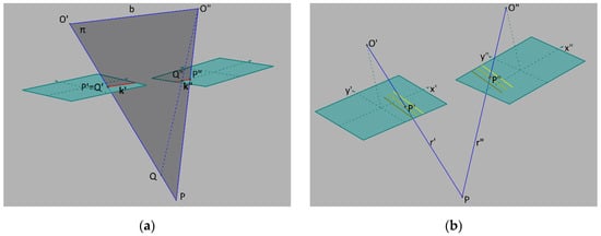 Three-dimensional reconstruction procedure: (a) calculated epipolar line in red; (b) the obtained key points and their resection. Symbol descriptions: O′, O″—left and right image projection centers; b—baseline, k′, k″—epipolar lines, respectively, on the left and the right image; π—epipolar plane; Q, P—points in 3D space; P′, P″, Q′, Q″—P, Q points projections on the left and the right image; r′, r″—homologous rays; x′, y′, x″, y″—image coordinates axis on the left and the right image.