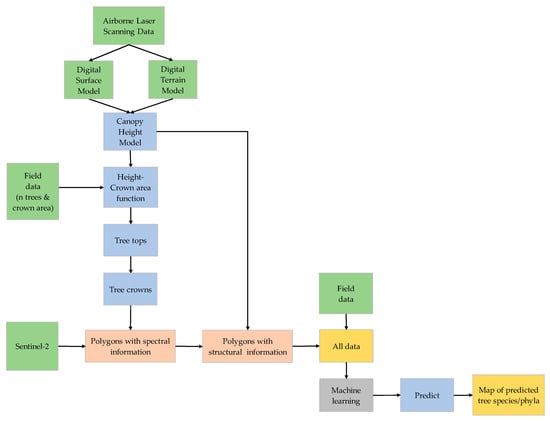 For tree species and phylum classification, we applied an object-based approach using automatically delineated tree crowns as spatial polygons (Figure 2). The data processing and analyses were performed in R (version 3.6.0) and QGIS (version 3.6.3). The classification models were used to predict the species and phyla of all trees present in the entire study area.