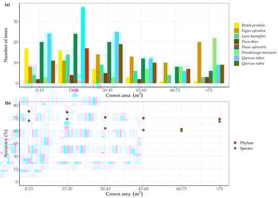 The number of trees per tree species for different tree crown area classes in validation data (a) and the classification accuracy in function of tree crown area class on both species and phylum levels (b).