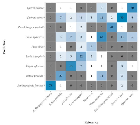 The confusion matrix in Figure 4 summarizes the results for the classification of the eight most common tree species and anthropogenic features. The classification was based on the model that used all variables (AVS). The misclassifications mostly occurred between common oak (Quercus robur), Scots pine (Pinus Sylvestris), and silver birch (Betula pendula). Species with the highest relative classification accuracies were Douglas fir (Pseudotsuga menziesii; 95.3%), northern red oak (Quercus rubra; 82.2%), and European beech (Fagus sylvatica; 81.8%). The lowest relative classification accuracies occurred for Norway spruce (Picea abies; 43.8%) and Japanese larch (Larix kaempferi; 55%).