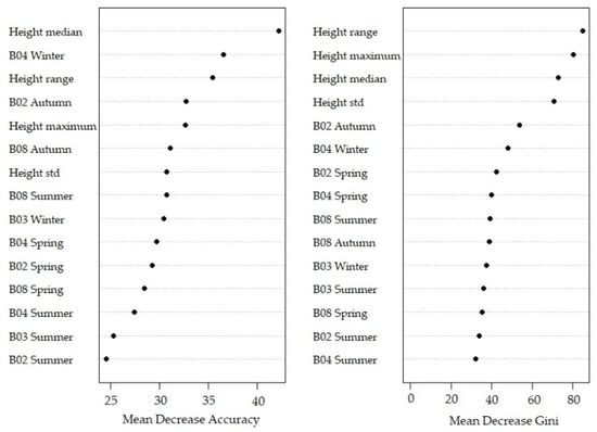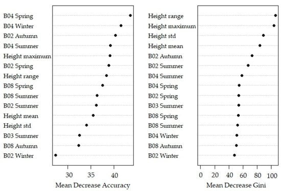 The variable importance plot (Figure 5) indicates that the important variable was the red (B04) band from the spring image, followed by the red (B04) band from the winter period. The variable height range had the highest MDG value.