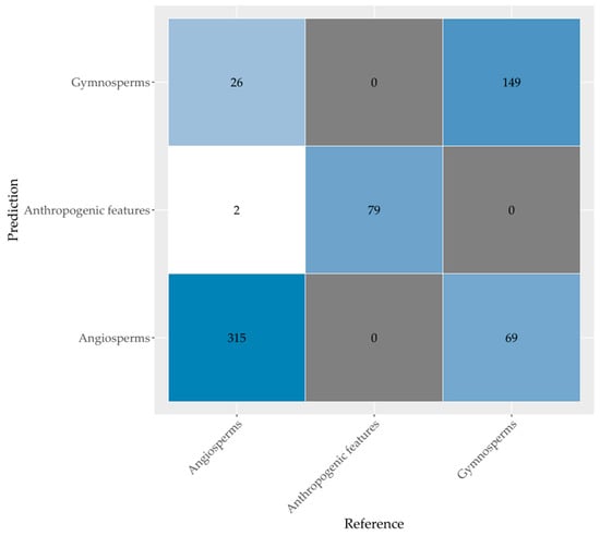The results of the classification accuracy of the tree phylum model using all variables (AVP) are presented in Figure 6. Of the 343 angiosperm trees, 29 trees were misclassified as gymnosperm trees (8.5%) and two as anthropogenic features (0.6%). Gymnosperm trees were only misclassified as angiosperm trees for 69 out of 218 tree crowns (31.2%). Scots pine had the highest contributions in the misclassifications; 41 out of 69 misclassified tree crowns were Scots pines (59.4%). The variable with the highest MDA was the median tree height (Figure 7).