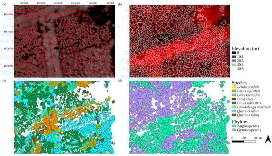 The AVS and the AVG classification models were used to identify all delineated tree crowns in the study area to species and phylum levels (Figure 8). First, the individual tree crown polygons were delineated on the CHM using a variable window filter, the size of which was determined by the tree crown area–height relationship (Figure 8a). The crown structural features were calculated from the CHM. Then, the spectral information was extracted for each delineated tree crown from the Sentinel-2 imagery (Figure 8b). The spectral and the crown structural information combined were used to construct a RF classification model with the field samples. This model was subsequently applied to predict the tree species (Figure 8c) and the tree phylum (Figure 8d) for each delineated tree crown. The tree species prediction was based on the eight most common tree species and included anthropogenic features. We used all 26 sampled species in the tree phylum prediction (Table 3).