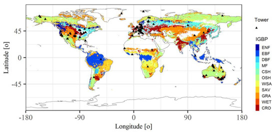 Figure 1. Geographical distribution of flux towers overlaid onto the 2005 Moderate Resolution Imaging Spectroradiometer (MODIS) International Geosphere–Biosphere Programme (IGBP) land cover map at a 0.5° × 0.5° resolution. ENF: evergreen needleleaf forests; EBF: evergreen broadleaf forests; DBF: deciduous broadleaf forests; MF: mixed forests; CSH: closed shrublands; OSH: open shrublands; WSA: woody savanna; SAV: savanna; GRA: grasslands; WET: permanent wetlands; CRO: croplands.