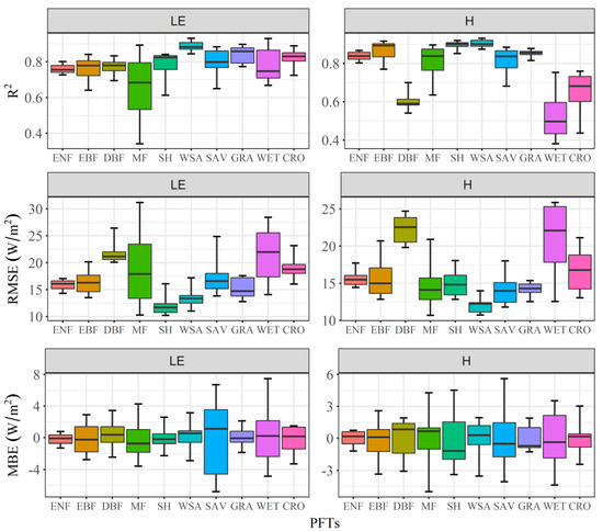 Figure 2. Random forest (RF) performance for simulating latent (LE) and sensible (H) heat fluxes as indicated by coefficient of determination (R2), root mean square error (RMSE) and mean bias error (MBE) across multiple plant functional types (PFTs). The black line within the box indicates the mean values of statistical metrics. Box boundaries indicate the 30th and 70th percentiles, whiskers below and above the box indicate the minimum and maximum values. ENF: evergreen needleleaf forests; EBF: evergreen broadleaf forests; DBF: deciduous broadleaf forests; MF: mixed forests; SH: board shrublands including both closed and open shrublands; WSA: woody savanna; SAV: savanna; GRA: grasslands; WET: permanent wetlands; CRO: croplands.