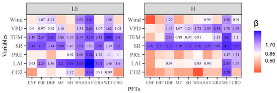 Figure 3. Morris sensitivity analysis for latent (LE) and sensible (H) heat fluxes across different plant functional types (PFTs). ENF: evergreen needleleaf forests; EBF: evergreen broadleaf forests; DBF: deciduous broadleaf forests; MF: mixed forests; SH: board shrublands including both closed and open shrublands; WSA: woody savanna; SAV: savanna; GRA: grasslands; WET: permanent wetlands; CRO: croplands; LAI: leaf area index; PRE: precipitation; SR: solar radiation; TEM: temperature; VPD: vapor pressure deficit.
