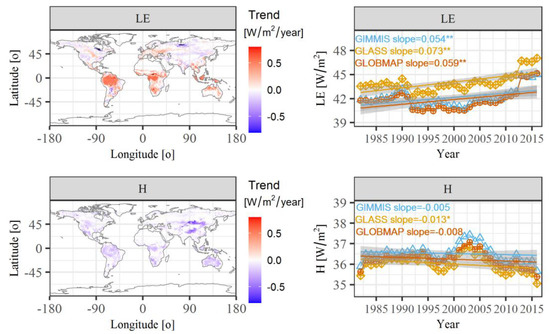 Figure 4. Temporal and spatial trends of latent (LE) and sensible (H) heat fluxes during 1982–2016. The spatial maps of long-term trends are averaged by outputs of RF models that are driven by three different LAI datasets. Only the cells that are statistically significant at p < 0.05 level are shown. * and ** indicate the significance levels at 0.05 and 0.01, respectively.