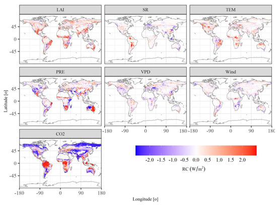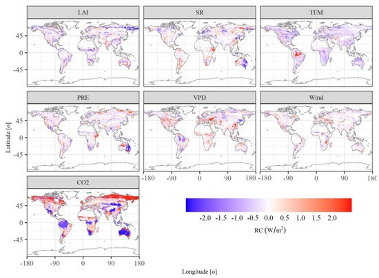 Almost all the predictor variables show a significant increasing trend during 1982–2016, except for the wind (Figure A2). Evidently, the largest increasing speed was presented in CO2, from 340 ppm in 1982 to more than 400 ppm in 2016, and increased by ~17%. LAI, TEM and VPD also show a strong increasing trend, as indicated by R2 ranging from 0.74 to 0.89. However, the SR and PRE showed a slightly increasing trend, but still significantly (p < 0.05). Any changes in these variables can lead to the changes in the surface energy fluxes and further exert influences on surface energy balance. Here, the relative contributions of such individual factor variations to H and LE changes were quantified by conducting single factor experiments. The spatial patterns show that the elevated CO2 concentration played a profound impact on the changes of LE (Figure 5). The elevated CO2 concentration contributed an increase in LE in the southern hemisphere and some parts in the mid-latitudes of northern hemisphere, such as eastern parts of Asia and western parts of Europe, while the decrease of LE caused by CO2 mainly occurred in high-latitudes of northern hemisphere and some arid regions, such as middle parts of Asia and west parts of North America. Nearly 70.5% of the Earth experienced an increase of LE under the effect of LAI increase. Meanwhile, 64.4% of the Earth undergone an increase of LE caused by the TEM rise. The areas that experienced an increase or a decrease in LE caused by PRE changes are comparable (51% vs. 49%). VPD, SR and wind exerted limited impacts on the LE. Our results show that the increased CO2 contributed most to the decrease of LE among these factors with a value of 0.61 W/m2 during 1982 2016, followed by the VPD and wind with the values of 0.032 W/m2 and 0.028 W/m2, respectively. On the contrary, the increase of LAI causes the most increase in LE with a value of 0.57 W/m2, followed by TEM, PRE and SR with the values of 0.26 W/m2, 0.08 W/m2 and 0.03 W/m2, respectively.
