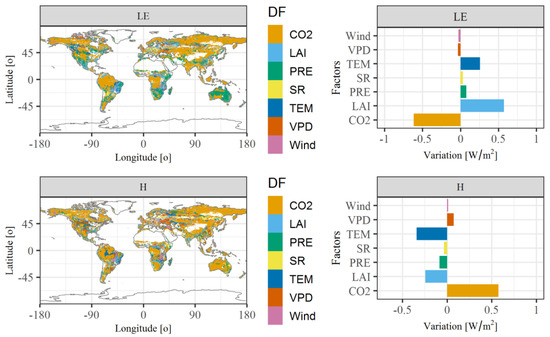 Figure 7. The relative contributions of different influencing factors to variations of latent (LE) and sensible (H) heat fluxes. The spatial maps indicate the dominant factors (DF) that contribute most to the variation of LE and H during 1982–2016. LAI: leaf area index; PRE: precipitation; SR: solar radiation; TEM: temperature; VPD: vapor pressure deficit.