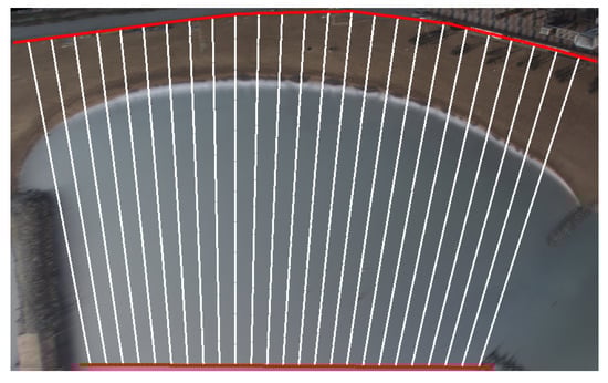 When working with the planviews, a beach is defined through two polylines (for land and water respectively) which are invariant in time (Figure 2, red lines). Both polylines have the same number of points, and the transects are defined as the lines connecting those points (Figure 2, white lines). The distance between transects is set to approximately one meter (the figure only shows a subset of transects, for clarity), and they are approximately normal to the shore, although this point is not critical for the proposed methodology.