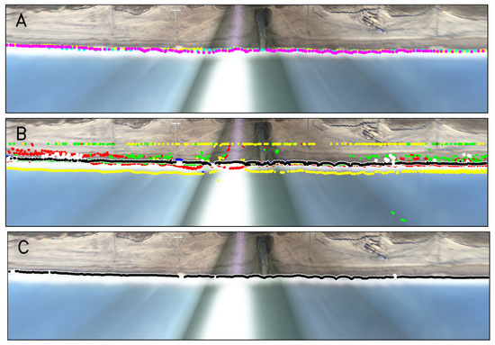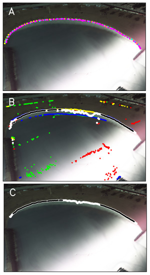 Examples of (A) manual shorelines digitized by the three users (in different colors), (B) raw shorelines out of the four methods (red, green, blue and yellow) and combined shoreline (white and black) and (C) filtered shoreline (white and black) of beach CFA1 on 27 November 2017 at 12 h. In (B), the raw shorelines come from Hue gradient (red), Saturation gradient (green), Value gradient (blue) and R/G gradient (yellow). In (B), the white points are the combined shoreline, while the points of the combined shoreline where px are in black (Equation (5)). In (C), the white points are the filtered shoreline, while the points of the filtered shoreline where px are in black (Equation (9)). Sun glare occurs in the central camera and some areas also show beach cusp presence.