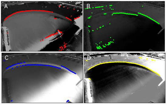 Examples of (A) Hue channel, (B) Saturation channel, (C) Value channel and (D) Red over Green channels, with the corresponding raw shorelines, of beach BCN3 on 7 November 2017 at 11 h (same planview as in Figure 5).
