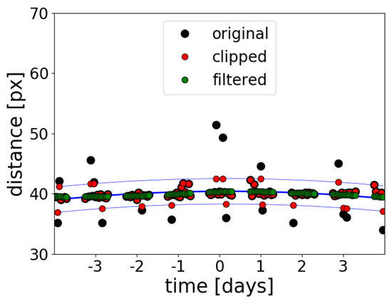 Illustration of time-wise clipping and filtering of matrix . Black dots stand for the original values, as a function of time (j); blue lines stand for the polynomial fitting and the limits for clipping (polynomial ); red dots are clipped data; green dots are filtered data. In this illustrative example, , and .