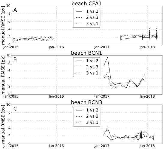Examples of the manually digitized shorelines by the three expert users have already been shown in Figure 3A, Figure 4A and Figure 5A. In order to evaluate the experimental errors of the ground truth data the differences between users are first computed for each beach and date. First, we compute the distances (in pixels) from each point digitized by a user “X” to the polyline passing through all the points of another user “Y”. The RMS of the distances corresponding to a complete image is used to estimate the error of the whole manual shorelines digitized by these two users in that image. Figure 8 displays these RMS distances in pixels between users, i.e., the RMSE of the manual shorelines, in the different dates for beaches CFA1, BCN1 and BCN3. Finally, the global RMSE in pixels of the manual shorelines in each beach are computed as the mean for all dates and users of the RMS distances between users (last column in Table 3).