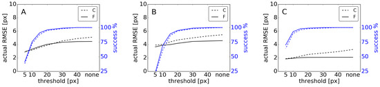 Actual RMSE (RMS distances in pixels between manual and automatic shorelines, in black) and success percentage (in blue) for all dates using different thresholds for the self-computed errors of beaches (A) CFA1, (B) BCN1 and (C) BCN3, for the combined (dashed) and the filtered (solid) shorelines.