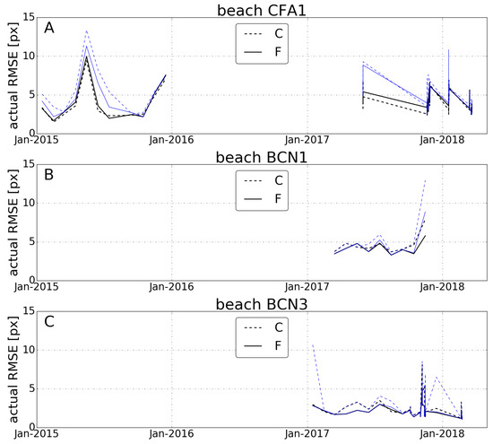 Actual RMSE in pixels (2 px m) of the automatic shorelines in the different dates of beaches (A) CFA1, (B) BCN1 and (C) BCN3, for the combined (dashed) and filtered (solid) shorelines, using a threshold of 20 px (black) or no threshold (blue) in the self-computed errors.