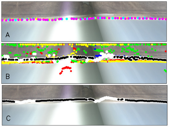 Examples of (A) original planview, (B) manual shorelines digitized by the three users (in different colors), (C) filtered shoreline (white and black) of beach BCN4 on 15 March 2017 at 12 h. The images do not have the original size of the planview but a zoom is applied to facilitate the visualization. In (C), the white points is the filtered shoreline, while the points of the filtered shoreline where px are in black.