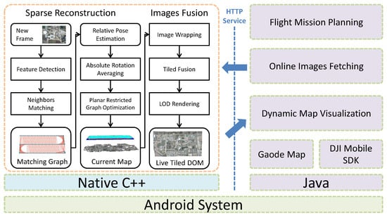 The framework of our system on android devices. All stitching algorithm pipelines are written by C++, which runs in the linux native layer, and the Java-based user interface (UI) calls live mosaic service through HTTP API. A way-point flight mission is planned and uploaded through DJI Mobile SDK, and images are fetched online with GPS information. The mosaic algorithm receives these images and stitches them incrementally during the flight. In addition, a tiled dynamic map layer is served though HTTP interface and visualized with GaoDe Map SDK.