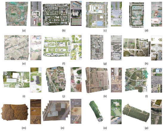 Mosaic results of the proposed method on public NPU DroneMap2 Dataset (a) mavic2-road (b) mavic-campus (c) mavic-factory (d) mavic-fengniao(e) mavic-huangqi (f) mavic-library (g) mavic-npu (h) mavic-river(i) mavic-warriors (j) mavic-yangxian (k) p4r-field (l) p4r-roads2 (m) phantom3-olathe (n) phantom3-strawberry (o) phantom4-mountain (p) xag-xinjiang. Some screenshots are highlighted to demonstrate the mosaic details. Although few mismatches are caused by moving objects, reconstruction drift and high buildings, which are highlighted in red arrows, our stitching quality is generally high for different sequences including mountains and buildings.