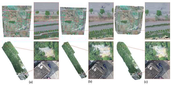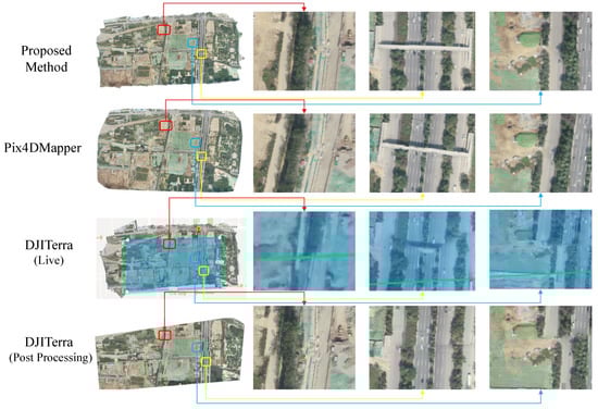The above dataset evaluation can only be compared with offline systems. Thus, we further evaluate our method by comparing with the live map function of software DJITerra. We use DJITerra to plan the flight mission and process the live downloaded preview images with our algorithm and Pix4DMapper. When using a gimbal for aerial photography, the camera is usually vertically downward. This assumption is easier for reconstruction 3D point cloud with dense stereo and stitching orthophoto with similarity assumption. However, the camera is not always vertical when a gimbal is not used. We reduce the overlap setting to 70% and allowed the camera to not be fully facing down because our system and DJITerra show good result in most traditional circumstances. The reconstruction becomes more challenging under this condition given that SLAM systems often require a higher overlap and the camera rotation reduces robustness. The mosaic result comparison of live map and offline is illustrated in Figure 5. We compare the live orthophoto of DJITerra by screenshots recorded given that it is covered by the postprocessing result. The comparison shows that our method is robust against low-overlap and camera rotations, where our algorithm outperforms even the existing novel offline methods. Moreover, our system only consumes approximately 1 min using x86 Linux computer to process this image sequence, and the flight time is nearly 20 min. This finding indicates that the algorithm is much faster than that used in real-time.