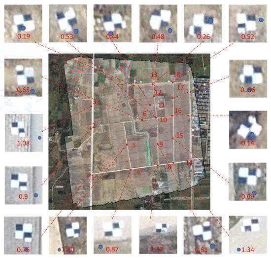 Detailed errors of GCPs in p4r-field dataset. The white–black marker size is cm, and blue dot indicates the GCP location. The absolute error indicates the distance between the marker center and GCP position; it is measured in meters with red text. Since we organize the screenshots manually, so that the resolution may look not equal. Although the root mean square error (RMSE) of our method is slightly larger than Pix4DMapper and DJITerra, it is precise for most applications.