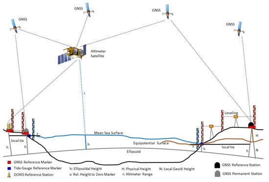 Sea level research nowadays is based on a number of measurement systems, which all have their own characteristics and deliver different types of observations [,]. Traditionally, sea level is observed at tide gauge stations, which usually also serve as height reference stations for national leveling networks and therefore define a height system of a country. Thus, sea level research across countries is closely linked to height system unification and needs to be regarded jointly. In order to analyze all observations, they need to be available in a common reference frame. Figure 1 shows an overview about the classical observation techniques and their connection to the reference systems.