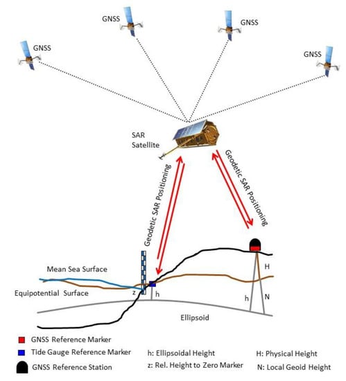 This work intends to address all three challenges, but the main focus is given to the connection of the tide gauge reference marker with the geometric GNSS network applying the geodetic SAR positioning technique []. With this technique tide gauges not permanently equipped with a GNSS receiver can be connected to the geometric network of a country with relatively little effort on a permanent basis (see Figure 2). With the X-Band TerraSAR-X and TanDEM-X SAR missions it was shown that 3D-positions can be determined with centimeter accuracy [,,]. For C-band SAR similar analyses have been performed with corner reflectors [] and by using active transponders as ground targets []. When combined with the flexibility of compact active transponders, it offers a relatively cheap and simple possibility to connect all tide gauges for an ocean area to the global geometric network. As a promising idea, a relative transfer of heights from nearby GNSS stations to the tide gauge station, if they both are observed in same SAR scene, can be considered (differential geodetic Stereo-SAR or SAR-leveling) []. A summary of the Geodetic SAR positioning technique including early results for the selected test cases is provided in Section 3.