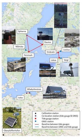 - Permanent GNSS Network Sites: The permanent GNSS stations Vergi, Loviisa, and Mårtsbo are equipped with an ECR, which is tied to the GNSS station but not linked with a tide gauge. These stations are intended to be used in order to perform an ellipsoidal height transfer from the GNSS station to the tide gauge station in a relative sense by doing differential ECR positioning (see Section 3). This short baseline experiment can be performed for linking Vergi to Loksa, Loviisa to Emäsalo, and Mårtsbo to Forsmark. In addition, the link between the collocation stations Władysławowo and Łeba can be used for this type of experiment.