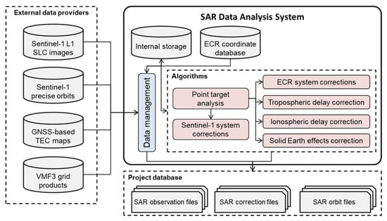 SAR data analysis system. Data sets and output files are marked in grey. Red boxes refer to methods and algorithms.