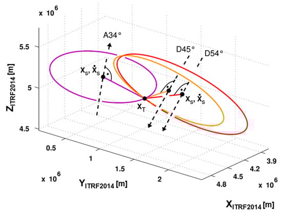 If the above Equation (3) is introduced into the Zero-Doppler Equations (1) and (2), the 3D location of a target with t and τ is reduced to a circle perpendicularly oriented to the satellite’s flight direction []. Figure 6 depicts three image acquisitions, one from an ascending and two from a descending satellite pass, all containing the same target. It is evident that in order to solve for the position vector, at least two acquisitions are required, most preferably acquired from different geometries.
