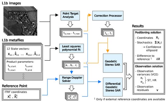 Processing scheme of geodetic stereo SAR for the standard (orange arrows) and the differential approach (blue arrows) [].
