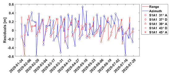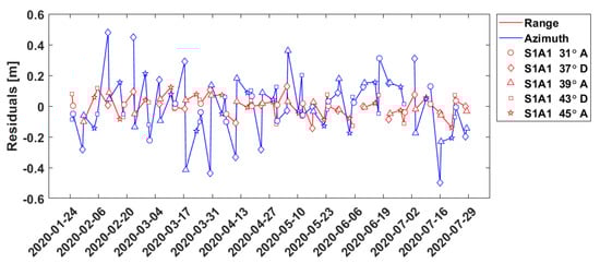 - Azimuth and range are extracted at subpixel level from the Zero-Doppler SLC Sentinel-1 images using Point Target Analysis (PTA) (see Section 3.1).