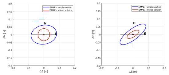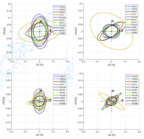 The vector denotes the estimates of the unknown parameters, while is the 3 × 3 variance-covariance matrix which provides the standard deviations of the target coordinates and which can be converted to the corresponding error ellipsoid. The weighting of the different observation types within the parameters estimation is done via variance component estimation (VCE), which yields additionally estimated range and azimuth standard deviations. Details about the quality indicators and the variance component estimation can be found in [].